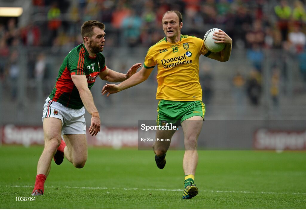 8 August 2015; Colm McFadden, Donegal, in action against Seamus O'Shea, Mayo. GAA Football All-Ireland Senior Championship Quarter-Final, Donegal v Mayo, Croke Park, Dublin. Picture credit: Sam Barnes / SPORTSFILE