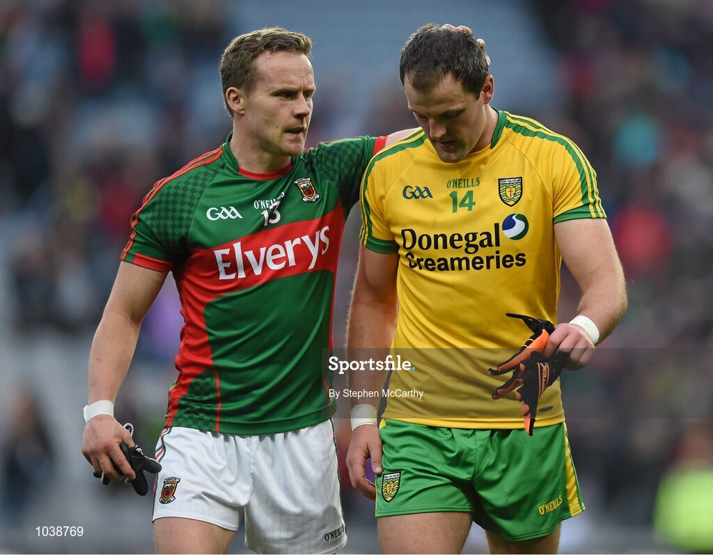 8 August 2015; Michael Murphy, Donegal, is consoled by Mayo's Andy Moran after the game. GAA Football All-Ireland Senior Championship Quarter-Final. Donegal v Mayo, Croke Park, Dublin. Picture credit: Stephen McCarthy / SPORTSFILE