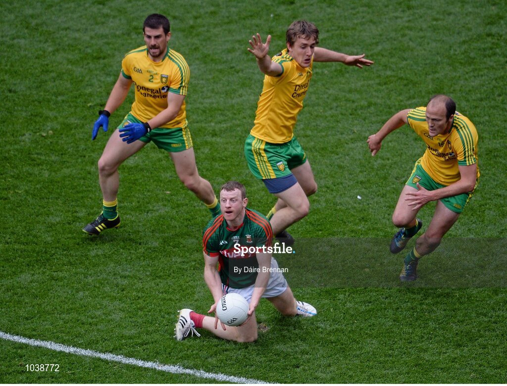 8 August 2015; Colm Boyle, Mayo, in action against Donegal players, left to right, Paddy McGrath, Hugh McFadden, and Colm McFadden. GAA Football All-Ireland Senior Championship Quarter-Final, Donegal v Mayo, Croke Park, Dublin. Picture credit: Dáire Brennan / SPORTSFILE