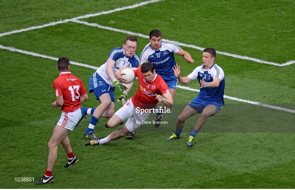 8 August 2015; Seán Cavanagh, Tyrone, in action against Monaghan players, left to right, Rory Beggan, Drew Wylie, and Ryan Wylie. GAA Football All-Ireland Senior Championship Quarter-Final, Monaghan v Tyrone, Croke Park, Dublin. Picture credit: Dáire Brennan / SPORTSFILE