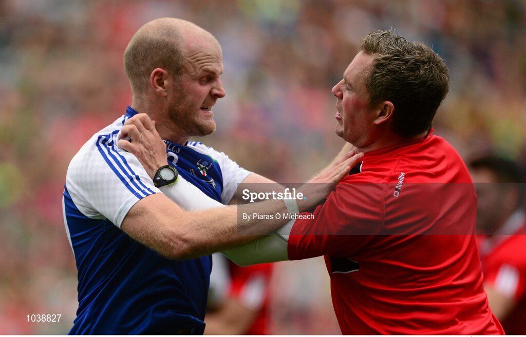 8 August 2015; Dick Clerkin, Monaghan, tussles with Tyrone selector Gavin Devlin during the second half. GAA Football All-Ireland Senior Championship Quarter-Final, Monaghan v Tyrone. Croke Park, Dublin. Picture credit: Piaras Ó Mídheach / SPORTSFILE