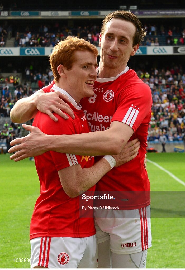 8 August 2015; Tyrone's Colm Cavanagh, right, and Peter Harte celebrate after the game. GAA Football All-Ireland Senior Championship Quarter-Final, Monaghan v Tyrone. Croke Park, Dublin. Picture credit: Piaras Ó Mídheach / SPORTSFILE