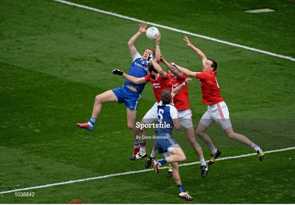 8 August 2015; Kieran Hughes, Monaghan, gets the ball ahead of Tyrone players, left to right, Justin McMahon, Cathal McCarron, and Colm Cavanagh, Tyrone. GAA Football All-Ireland Senior Championship Quarter-Final, Monaghan v Tyrone, Croke Park, Dublin. Picture credit: Dáire Brennan / SPORTSFILE