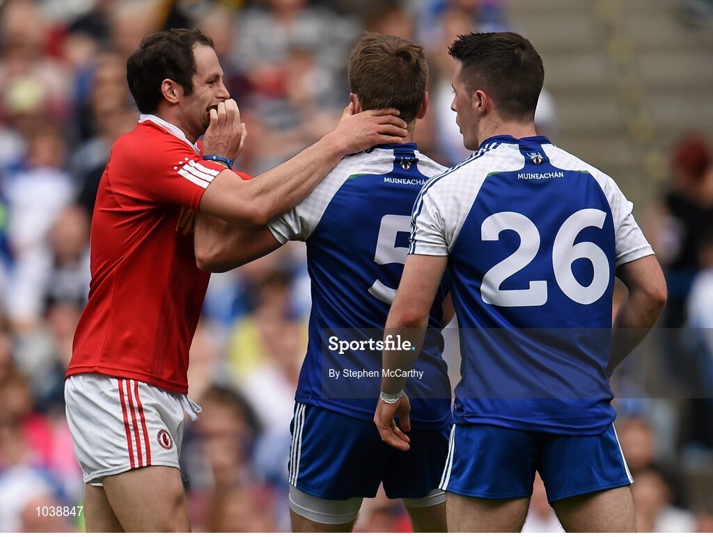 8 August 2015; Ronan McNabb, Tyrone, and Dessie Mone, Monaghan, tussle off the ball. GAA Football All-Ireland Senior Championship Quarter-Final, Monaghan v Tyrone. Croke Park, Dublin. Picture credit: Stephen McCarthy / SPORTSFILE