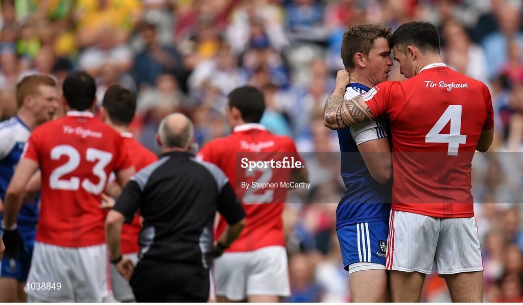 8 August 2015; Dessie Mone, Monaghan, and Cathal McCarron, Tyrone, exchange words. GAA Football All-Ireland Senior Championship Quarter-Final, Monaghan v Tyrone. Croke Park, Dublin. Picture credit: Stephen McCarthy / SPORTSFILE