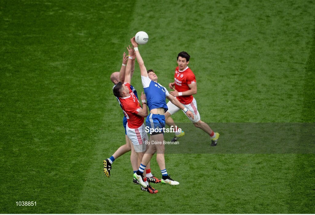 8 August 2015; Dick Clerkin, and Darren Hughes, Monaghan, in action against Tieran McCann, and Mattie Donnelly, Tyrone. GAA Football All-Ireland Senior Championship Quarter-Final, Monaghan v Tyrone, Croke Park, Dublin. Picture credit: Dáire Brennan / SPORTSFILE