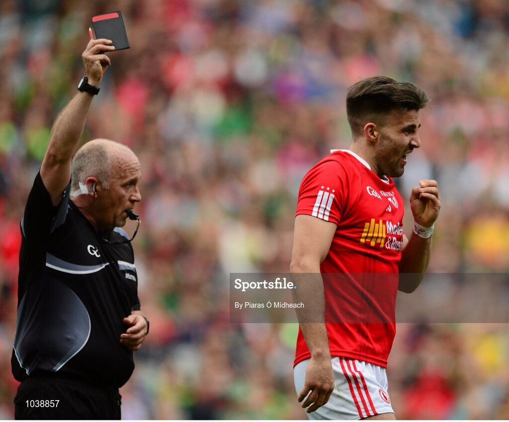 8 August 2015; Tiernan McCann, Tyrone, leaves the field after being shown the black card by referee Marty Duffy. GAA Football All-Ireland Senior Championship Quarter-Final, Monaghan v Tyrone. Croke Park, Dublin. Picture credit: Piaras Ó Mídheach / SPORTSFILE