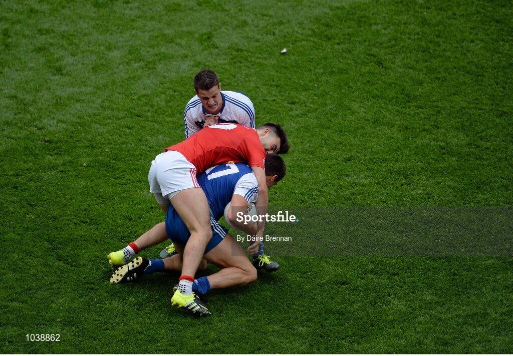 8 August 2015; Tiernan McCann, Tyrone, pulls down Drew Wylie, Monaghan, which resulted in McCann receiving a black card. GAA Football All-Ireland Senior Championship Quarter-Final, Monaghan v Tyrone, Croke Park, Dublin. Picture credit: Dáire Brennan / SPORTSFILE
