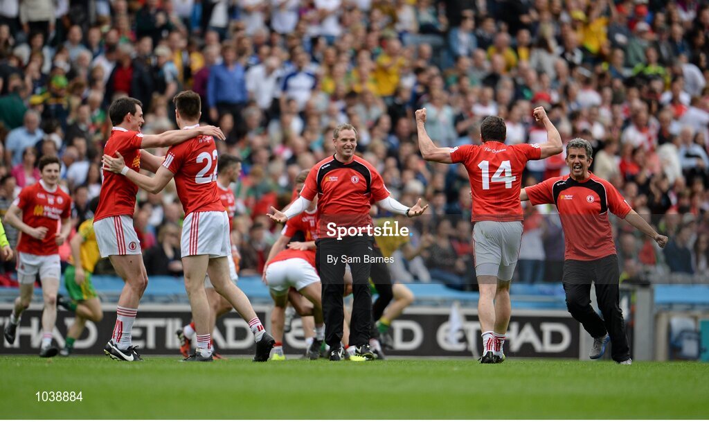 8 August 2015;Tyrone players celebrate with backroom staff at the final whistle. GAA Football All-Ireland Senior Championship Quarter-Final, Monaghan v Tyrone, Croke Park, Dublin. Picture credit: Sam Barnes / SPORTSFILE