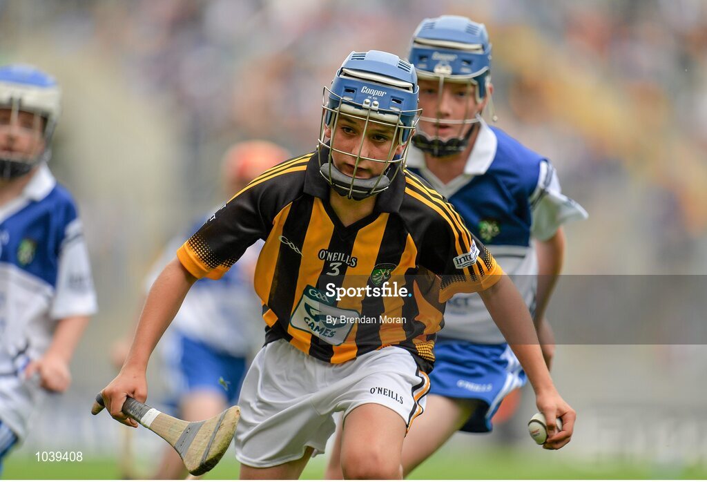 9 August 2015; Gerard Kavanagh, Myshall NS, Carlow, representing Kilkenny, in action against Jason Murphy, Horeswood NS, New Ross, Wexford, representing Waterford, during the Cumann na mBunscol INTO Respect Exhibition Go Games 2015 at Kilkenny v Waterford - GAA Hurling All-Ireland Senior Championship Semi-Final. Croke Park, Dublin. Picture credit: Brendan Moran / SPORTSFILE