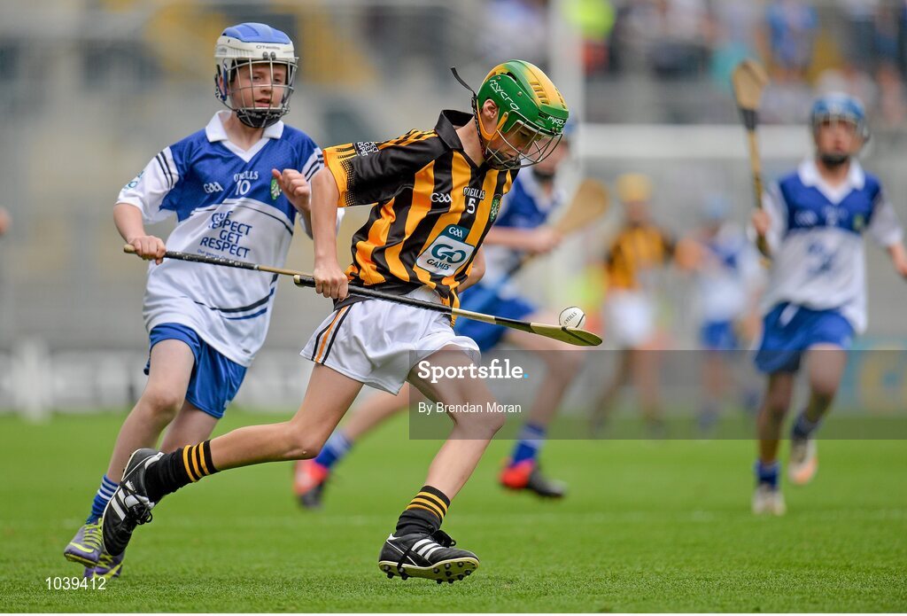 9 August 2015; Ian Byrne, Glenmore NS, Kilkenny, representing Kilkenny, in action against Luke Waterhouse, Francis Street CBS, Francis Street, Dublin, representing Waterford, during the Cumann na mBunscol INTO Respect Exhibition Go Games 2015 at Kilkenny v Waterford - GAA Hurling All-Ireland Senior Championship Semi-Final. Croke Park, Dublin. Picture credit: Brendan Moran / SPORTSFILE