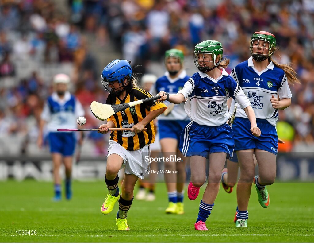 9 August 2015; Amber House, Rathcoyle NS, Kiltegan, Wicklow, representing Kilkenny, in action against Lucy O’Kane, 3, St Johns PS, Coleraine, Derry, and Emer O’Donnell, St Patrick’s Girls, Carndonagh, Donegal, representing Waterford, during the Cumann na mBunscol INTO Respect Exhibition Go Games 2015 at Kilkenny v Waterford - GAA Hurling All-Ireland Senior Championship Semi-Final. Croke Park, Dublin. Picture credit: Ray McManus / SPORTSFILE