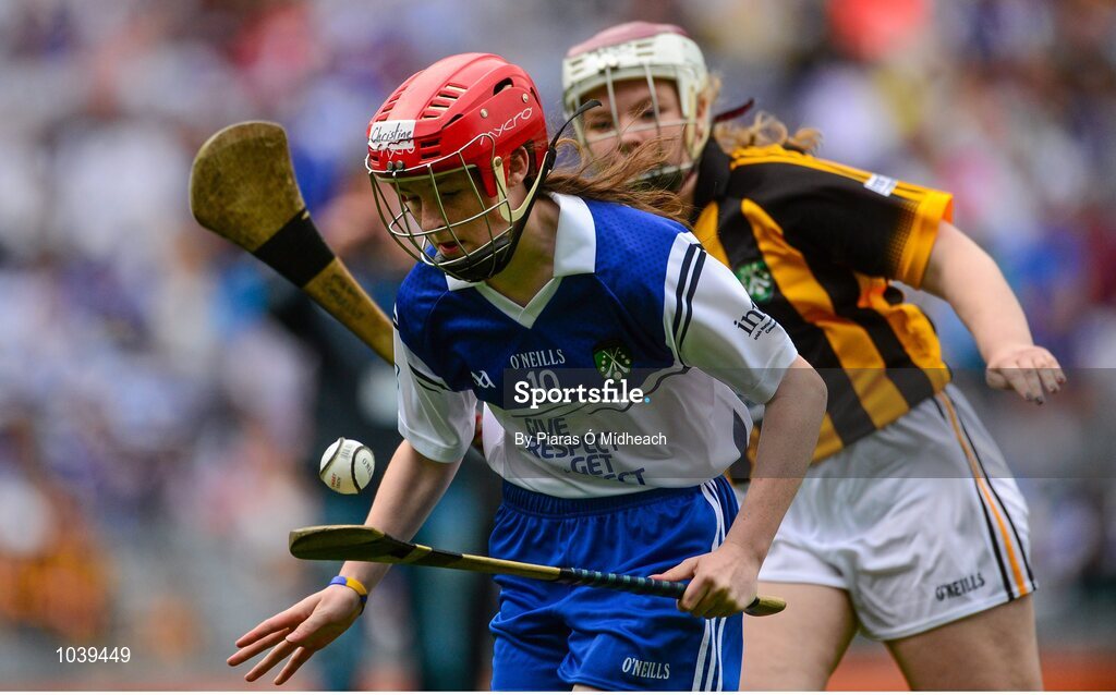9 August 2015; Christine Shanahan, Scoil Olaf, Dundrum, Dublin 16, representing Waterford, in action against Megan Greally, representing St Oliver Plunkett NS, Athenry, Galway, during the the Cumann na mBunscol INTO Respect Exhibition Go Games 2015 at Kilkenny v Waterford - GAA Hurling All-Ireland Senior Championship Semi-Final. Croke Park, Dublin. Picture credit: Piaras Ó Mídheach / SPORTSFILE