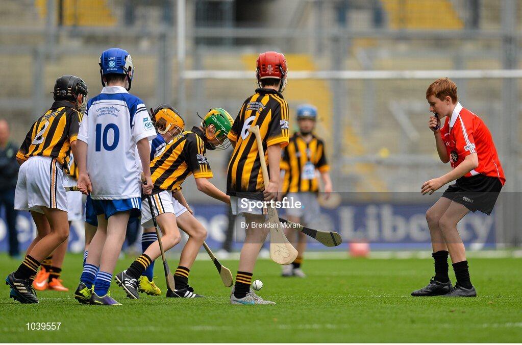 9 August 2015; Referee Ely Cullen, St Mary's NS, Ballygunner, Waterford, throws in the sliotar betwekn Kilkenny and Waterford during the Cumann na mBunscol INTO Respect Exhibition Go Games 2015 at Kilkenny v Waterford - GAA Hurling All-Ireland Senior Championship Semi-Final. Croke Park, Dublin. Picture credit: Brendan Moran / SPORTSFILE