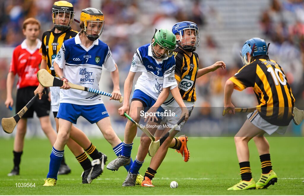 9 August 2015; Brody Murphy, Ballymurn NS, Enniscorthy, Wexford, representing Waterford, in action against Seán Magill, Scoil Mhuire na nGael, Dundalk, Louth, representing Kilkenny, during the Cumann na mBunscol INTO Respect Exhibition Go Games 2015 at Kilkenny v Waterford - GAA Hurling All-Ireland Senior Championship Semi-Final. Croke Park, Dublin. Picture credit: Stephen McCarthy / SPORTSFILE