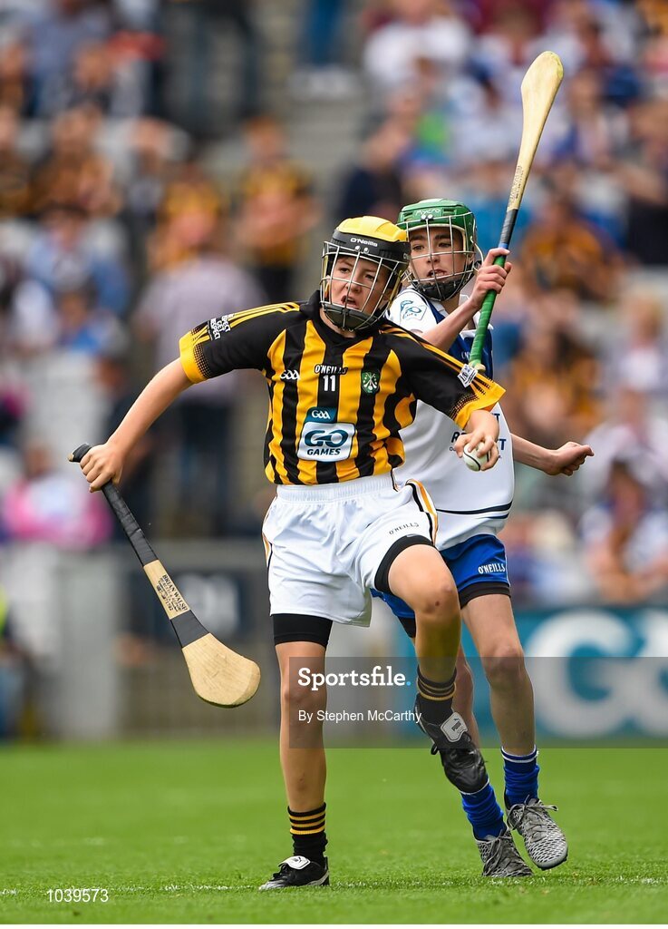 9 August 2015; Conor Burke, St Mark's SNS, Springfield, Dublin, representing Kilkenny, in action against Brody Murphy, Ballymurn NS, Enniscorthy, Wexford, representing Waterford, during the Cumann na mBunscol INTO Respect Exhibition Go Games 2015 at Kilkenny v Waterford - GAA Hurling All-Ireland Senior Championship Semi-Final. Croke Park, Dublin. Picture credit: Stephen McCarthy / SPORTSFILE