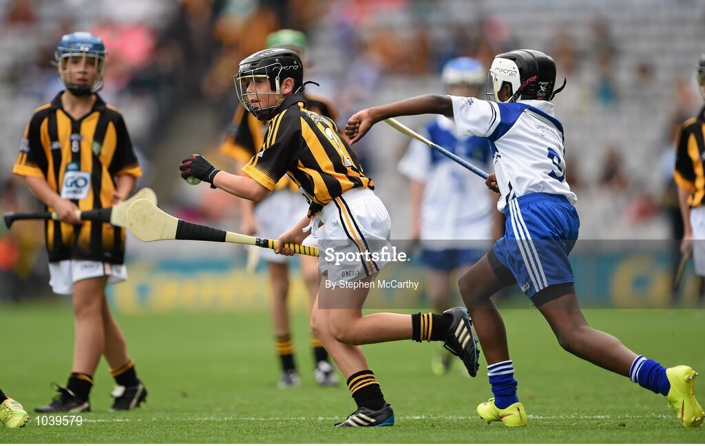9 August 2015; Oisín Ó Ceallaigh, Gaelscoil Eoghain Uí Thuairisc, Ceatharlach, representing Kilkenny, in action against Kenneth Ogun, St Enda’s NS, Carraroe, Sligo, representing Waterford, during the Cumann na mBunscol INTO Respect Exhibition Go Games 2015 at Kilkenny v Waterford - GAA Hurling All-Ireland Senior Championship Semi-Final. Croke Park, Dublin. Picture credit: Stephen McCarthy / SPORTSFILE