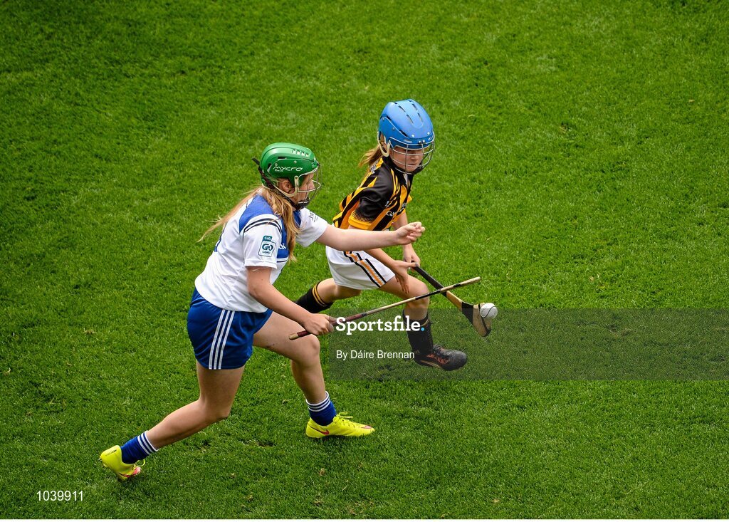 9 August 2015; Ellen Regan, Crinkill NS, Birr, Offaly, representing Waterford, in action against Sophie Bermingham, Rathcoyle NS, Kiltegan, Wicklow, representing Kilkenny, during the Cumann na mBunscol INTO Respect Exhibition Go Games 2015 at Kilkenny v Waterford - GAA Hurling All-Ireland Senior Championship Semi-Final. Croke Park, Dublin. Picture credit: Dáire Brennan / SPORTSFILE