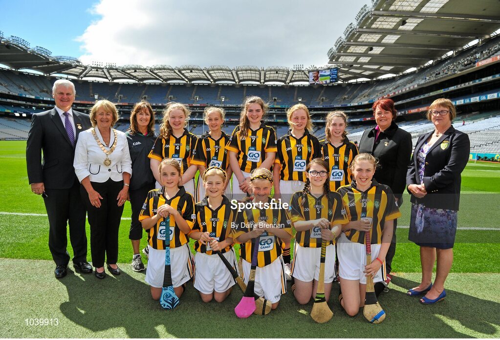 9 August 2015; Uachtarán Chumann Lúthchleas Gael Aogán Ó Fearghail, President of the INTO Emma Dineen, President of the Camogie Association Catherine Neary, President of Cumann na mBunscoil Maireád O'Callaghan, with the Kilkenny camogie team, back row, left to right, Megan Greally, St. Oliver Plunkett NS, Athenry, Galway, Laura Friel, Mercy Convent NS, Naas, Kildare, Hannah Dooley, Ballinamere NS, Tullamore, Offaly, Fianna Byrne, Kilanure NS, Mountrath, Laois, Eva Collins, St. Canice’s Ed, Kilkenny, front row, left to right, Kate Crilly, Foley PS, Tasagh, Aramgh, Sophie Bermingham, Rathcoyle NS, Kiltegan, Wicklow, Amber House, Rathcoyle NS, Kiltegan, Wicklow, Beth Duffy, St. Mura’s NS, Burnfoot, Donegal, Katie Quinlivan, Loreto PS, Rathfarnham, Dublin, before the Cumann na mBunscol INTO Respect Exhibition Go Games 2015 at Kilkenny v Waterford - GAA Hurling All-Ireland Senior Championship Semi-Final. Croke Park, Dublin. Picture credit: Dáire Brennan / SPORTSFILE