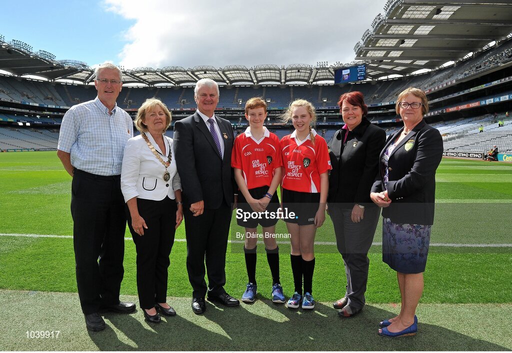 9 August 2015; Assistant Secretary of Cumann na mBunscoil Tim O'Byrne, Uachtarán Chumann Lúthchleas Gael Aogán Ó Fearghail, President of the INTO Emma Dineen, President of the Camogie Association Catherine Neary, President of Cumann na mBunscoil Maireád O'Callaghan, with referees Ely Cullen and Sarah Maher, both from St. Mary's NS, Ballygunner, Waterford, beofre the Cumann na mBunscol INTO Respect Exhibition Go Games 2015 at Kilkenny v Waterford - GAA Hurling All-Ireland Senior Championship Semi-Final. Croke Park, Dublin. Picture credit: Dáire Brennan / SPORTSFILE