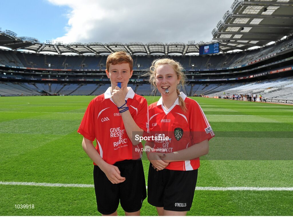 9 August 2015; Referees Ely Cullen and Sarah Maher, both from St. Mary's NS, Ballygunner, Waterford, before the Cumann na mBunscol INTO Respect Exhibition Go Games 2015 at Kilkenny v Waterford - GAA Hurling All-Ireland Senior Championship Semi-Final. Croke Park, Dublin. Picture credit: Dáire Brennan / SPORTSFILE