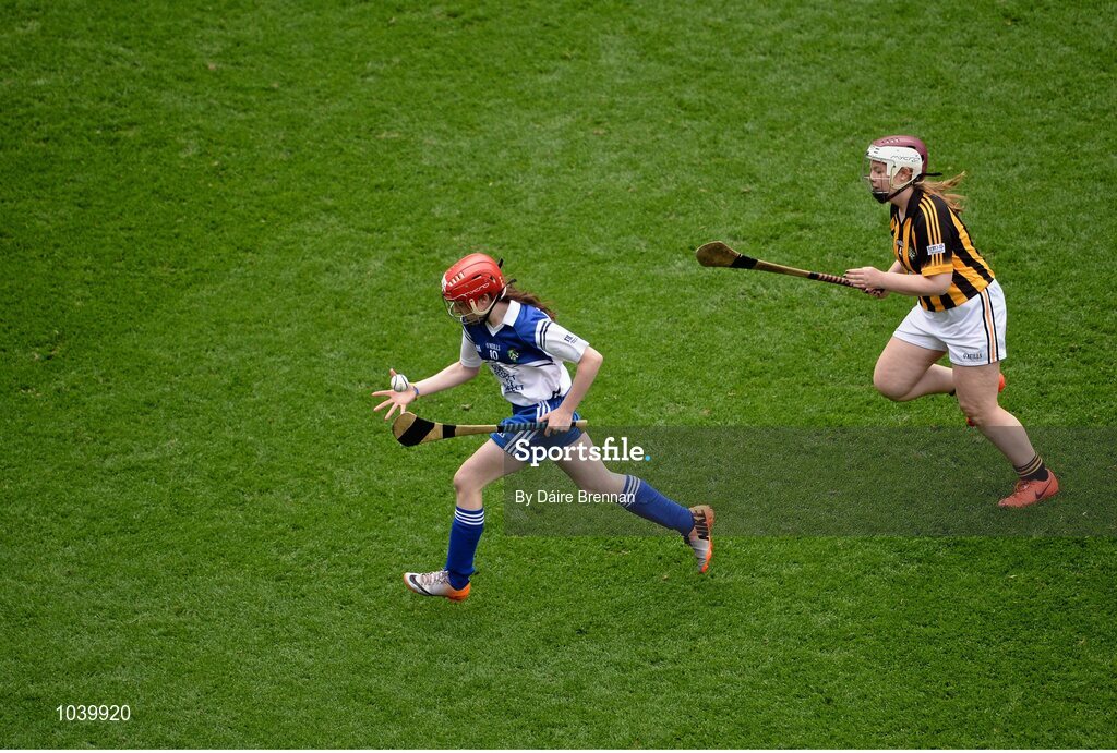 9 August 2015; Christine Shanahan, Scoil Olaf, Dundrum, Dublin, representing Waterford, in action against Megan Greally, St. Oliver Plunkett NS, Athenry, Galway, representing Kilkenny, during the Cumann na mBunscol INTO Respect Exhibition Go Games 2015 at Kilkenny v Waterford - GAA Hurling All-Ireland Senior Championship Semi-Final. Croke Park, Dublin.Picture credit: Dáire Brennan / SPORTSFILE