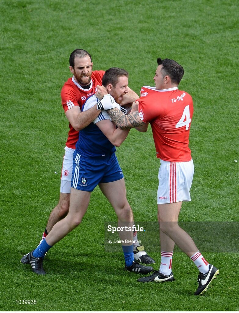 8 August 2015; Justin McMahon, left, and Cathal McCarron, Tyrone, get involved in a scuffle with Owen Duffy, Monaghan. GAA Football All-Ireland Senior Championship, Quarter-Final, Monaghan v Tyrone. Croke Park, Dublin. Picture credit: Dáire Brennan / SPORTSFILE