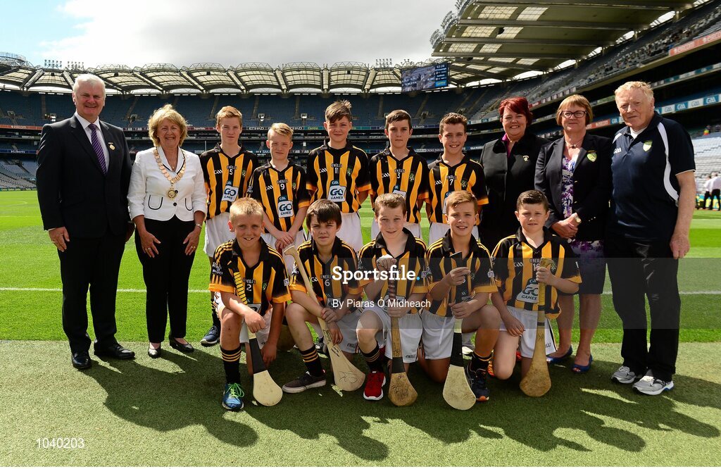 9 August 2015; Uachtarán Chumann Lúthchleas Gael Aogán Ó Fearghail, President of the INTO Emma Dineen, President of the Camogie Association Catherine Neary, President of Cumann na mBunscoil Maireád O'Callaghan with the Kilkenny hurling team, back row, from left, Ian Byrne, Glenmore NS Kilkenny, Ronan Donnelly, St. Patrick’s PS, Donaghmore, Tyrone, Conor Burke, St Mark's SNS, Springfield, Dublin, Gerard Kavanagh, Myshall NS, Carlow, Seán Magill, Scoil Mhuire na nGael, Dundalk, Louth. Front row from left, Oisín Ó Ceallaigh, Gaelscoil Eoghan Uí Thuairisc, Carlow, Charlie Hamilton, St, Joseph’s NS, Dromahair, Leitrim, Peter Doyle, St. Felim’s NS, Ballinagh, Cavan, Thomas Lonergan, Dunboyne SNS, Meath, Ryan Devlin, Blessed Patrick O’Loughran, Dungannon, Tyrone. Cumann na mBunscol INTO Respect Exhibition Go Games 2015 at Kilkenny v Waterford - GAA Hurling All-Ireland Senior Championship Semi-Final. Croke Park, Dublin. Picture credit: Piaras Ó Mídheach / SPORTSFILE