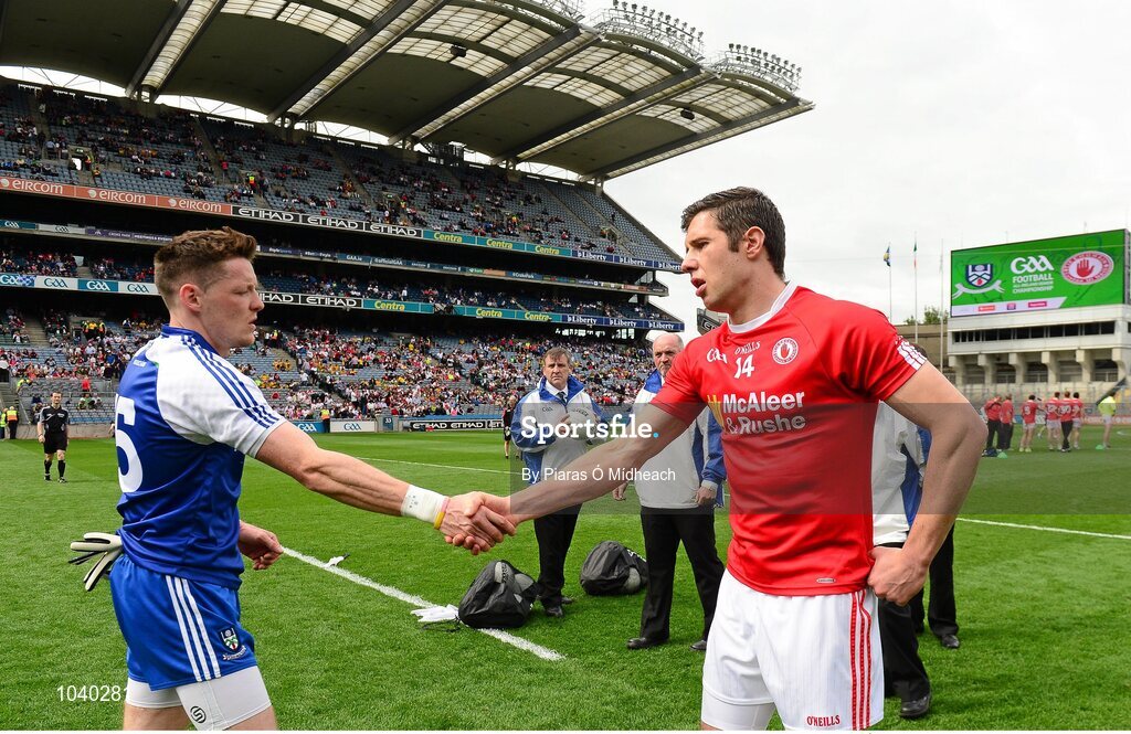 8 August 2015; Team captains Conor McManus, Monaghan, left, and Seán Cavanagh, Tyrone, before the game. GAA Football All-Ireland Senior Championship Quarter-Final, Monaghan v Tyrone. Croke Park, Dublin. Picture credit: Piaras Ó Mídheach / SPORTSFILE
