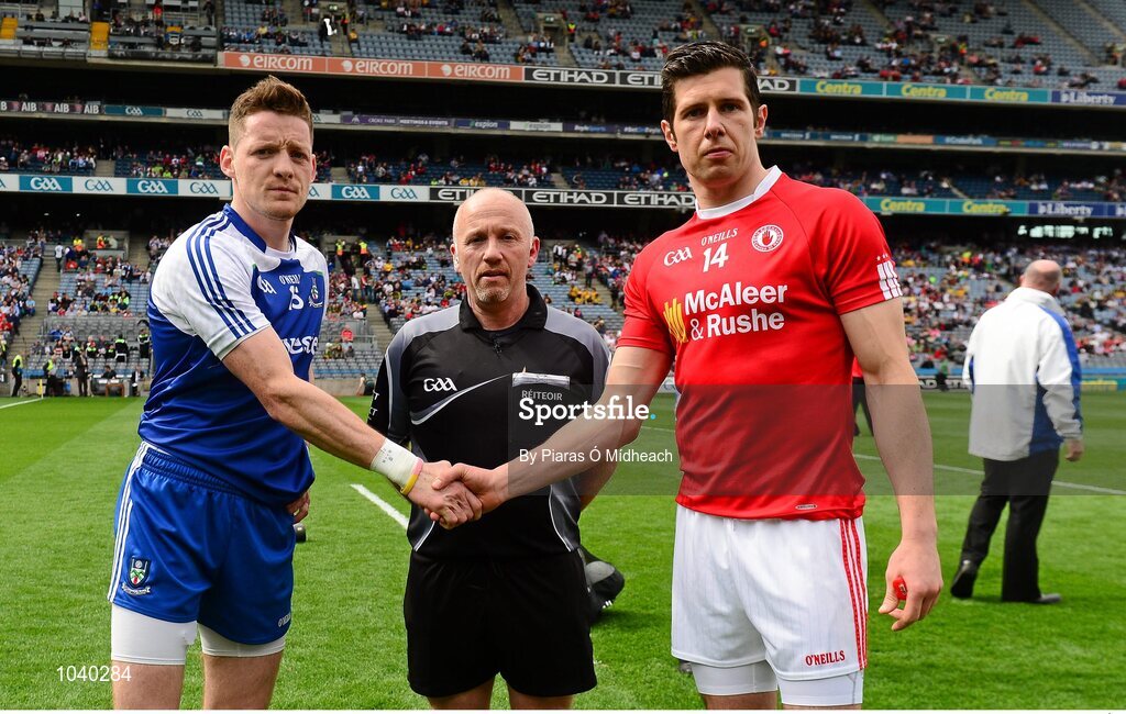 8 August 2015; Referee Marty Duffy with team captains Conor McManus, Monaghan, left, and Seán Cavanagh, Tyrone, before the game. GAA Football All-Ireland Senior Championship Quarter-Final, Monaghan v Tyrone. Croke Park, Dublin. Picture credit: Piaras Ó Mídheach / SPORTSFILE