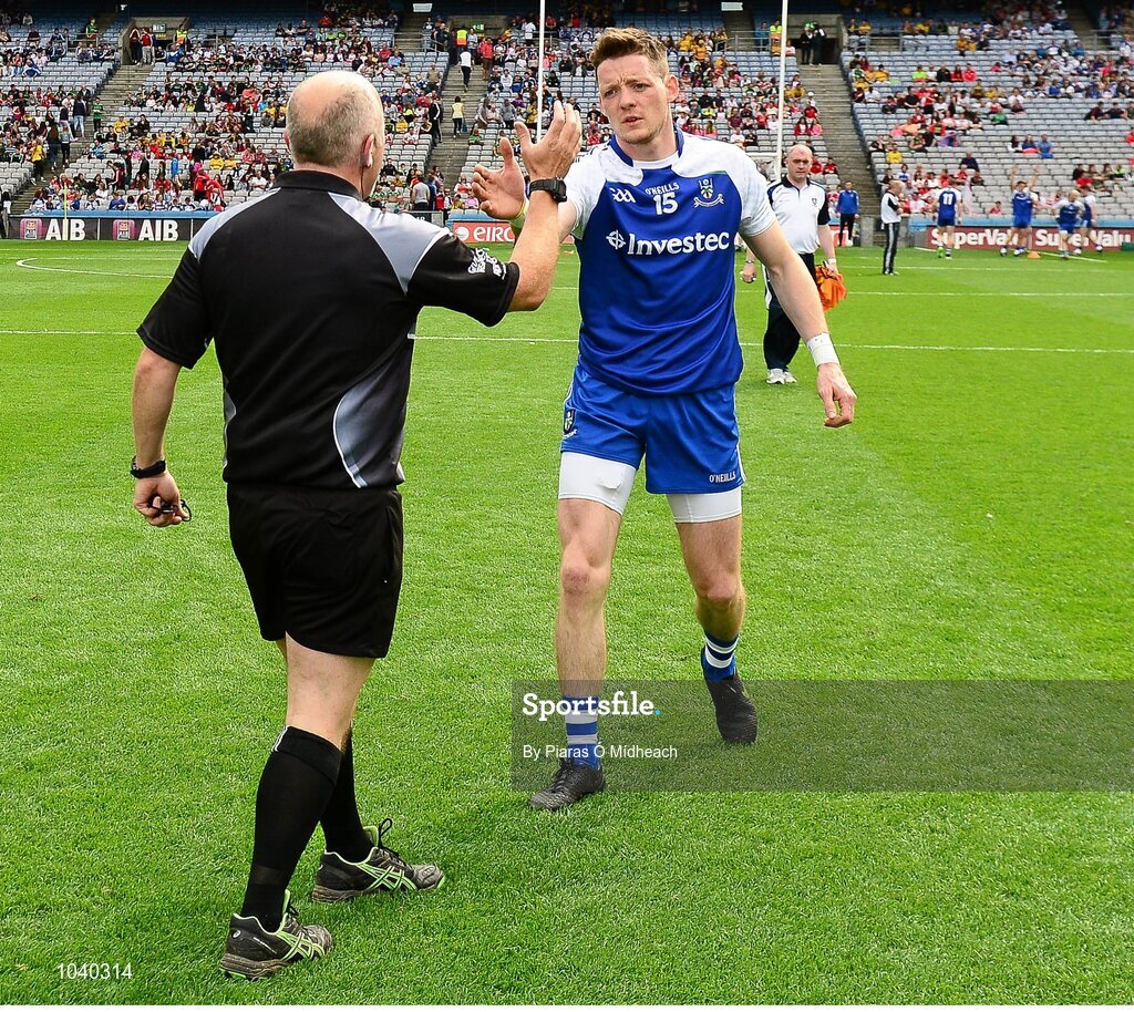 8 August 2015; Referee Marty Duffy with Monaghan captain Conor McManus. GAA Football All-Ireland Senior Championship Quarter-Final, Monaghan v Tyrone. Croke Park, Dublin. Picture credit: Piaras Ó Mídheach / SPORTSFILE