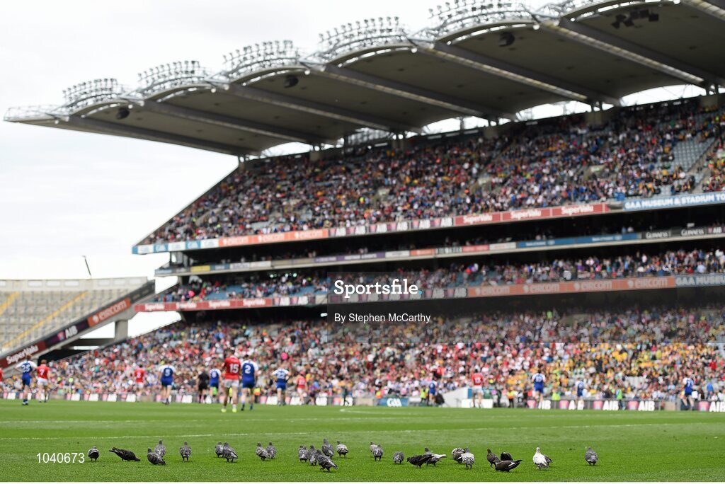 8 August 2015; Pidgeons feed on the pitch during the game. GAA Football All-Ireland Senior Championship Quarter-Final, Monaghan v Tyrone. Croke Park, Dublin. Picture credit: Stephen McCarthy / SPORTSFILE