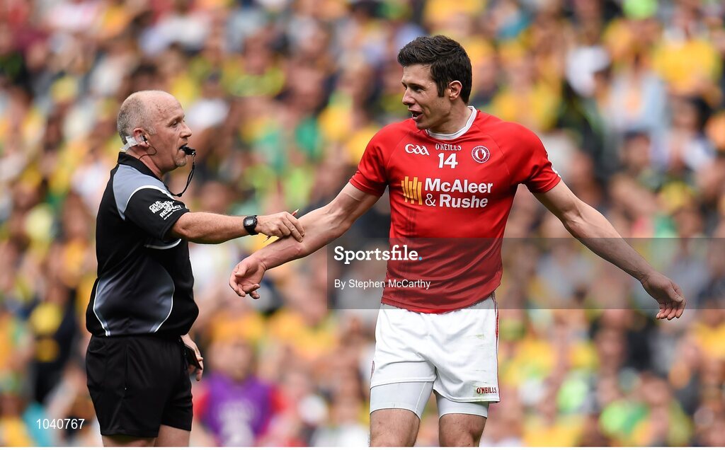 8 August 2015; Sean Cavanagh, Tyrone, with referee Marty Duffy. GAA Football All-Ireland Senior Championship Quarter-Final, Monaghan v Tyrone. Croke Park, Dublin. Picture credit: Stephen McCarthy / SPORTSFILE