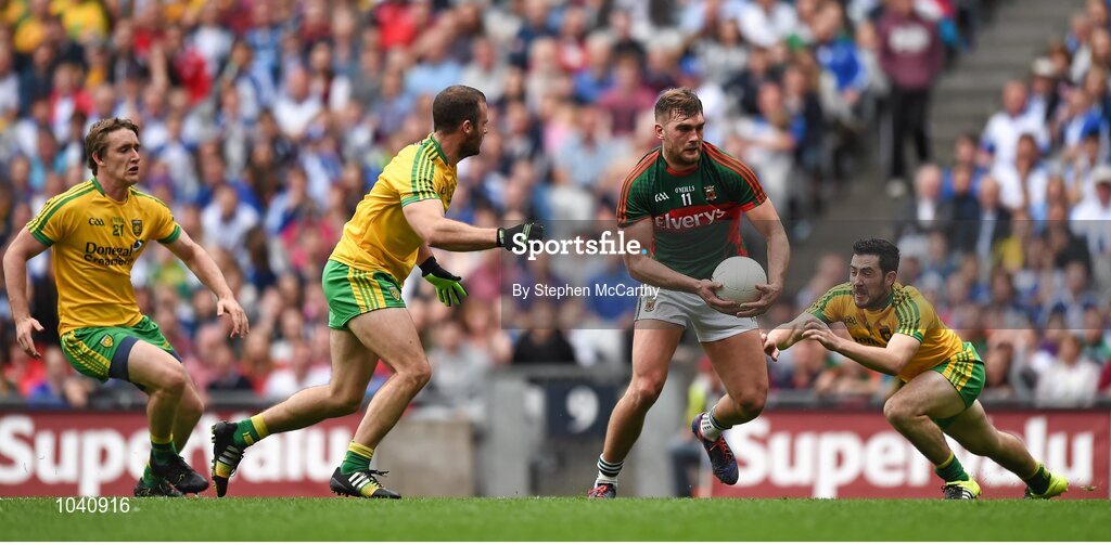 8 August 2015; Aidan O'Shea, Mayo, on his way to scoring his side's first goal despite the attention of Donegal players, from left, Hugh McFadden, Neil McGee and Ryan McHugh. GAA Football All-Ireland Senior Championship Quarter-Final. Donegal v Mayo, Croke Park, Dublin. Picture credit: Stephen McCarthy / SPORTSFILE