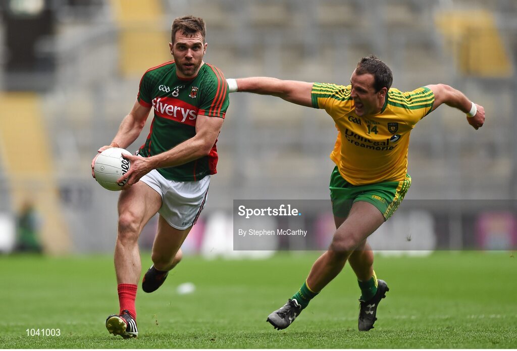 8 August 2015; Seamus O'Shea, Mayo, in action against Michael Murphy, Donegal. GAA Football All-Ireland Senior Championship Quarter-Final. Donegal v Mayo, Croke Park, Dublin. Picture credit: Stephen McCarthy / SPORTSFILE