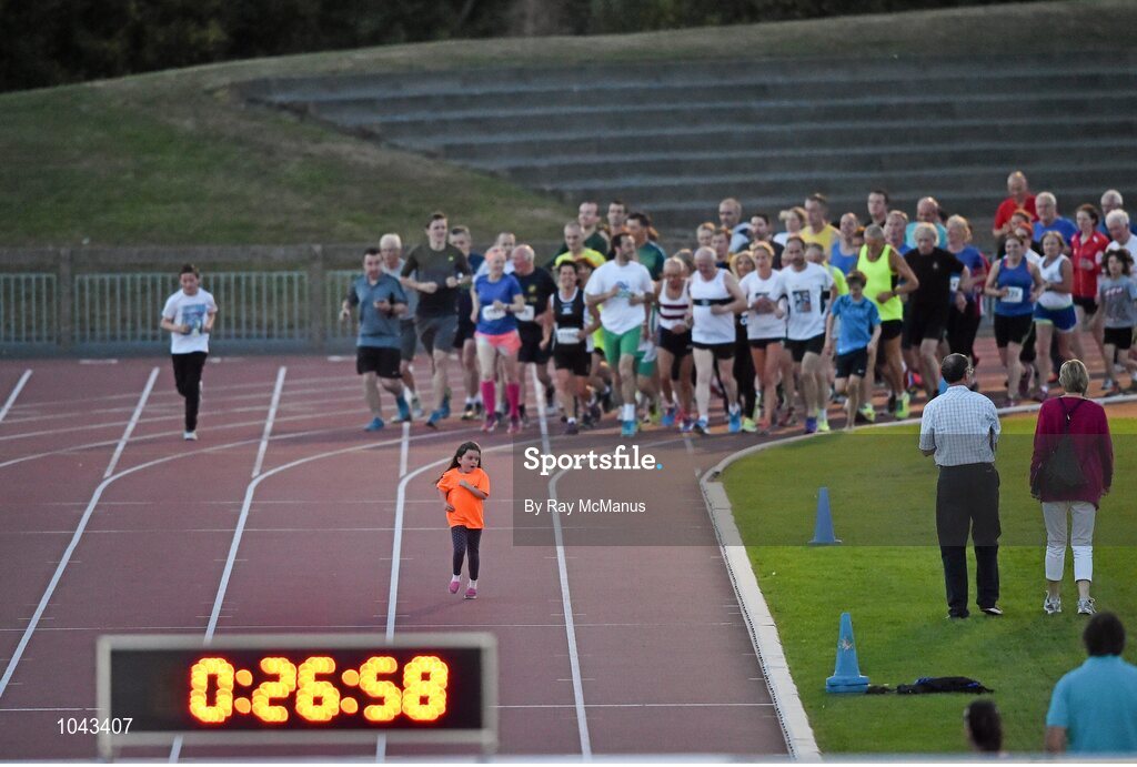 18 August 2015; Hayleigh Bone, age 6, leads her grandad and the field as Frank Greally, who set a record for the 10,000M 45 years ago on this day, pictured as he runs a one of the many laps around Morton Stadium for 30.17 - the record time set on the night. Frank Greally's Gratitude Run. Morton Stadium, Dublin Picture credit: Ray McManus / SPORTSFILE