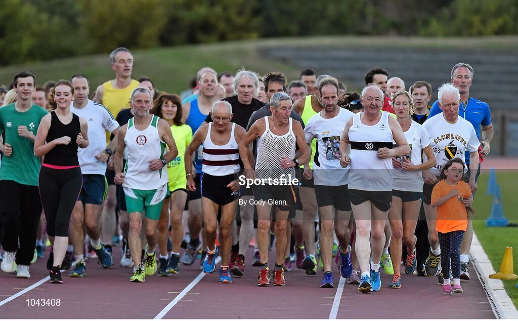 18 August 2015; Frank Greally, second from right, who set a record for the 10,000M 45 years ago on this day, runs alongside his granddaughter Hayleigh Bone, age 6, while running around Morton Stadium for 30.17 - the record time set on the night. Frank Greally's Gratitude Run. Morton Stadium, Dublin. Picture credit: Cody Glenn / SPORTSFILE