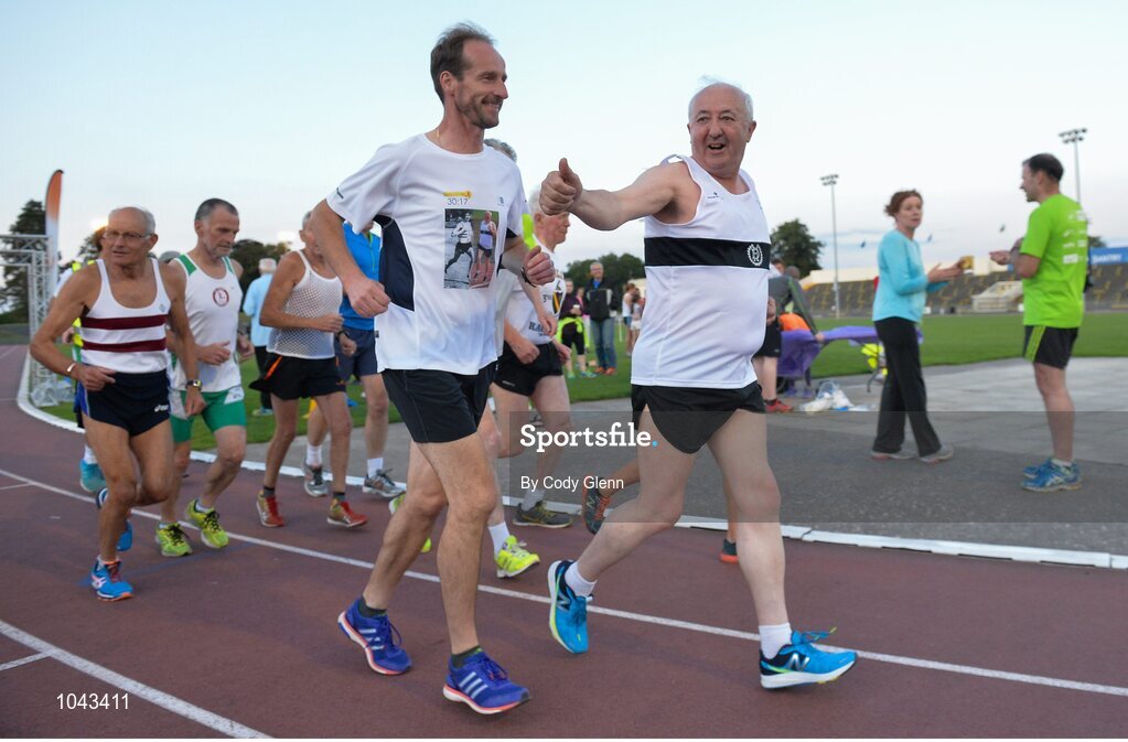 18 August 2015; Frank Greally, front, who set a record for the 10,000M 45 years ago on this day, gives a thumbs up to his grandchildren while running around Morton Stadium for 30.17 - the record time set on the night. Frank Greally's Gratitude Run. Morton Stadium, Dublin. Picture credit: Cody Glenn / SPORTSFILE