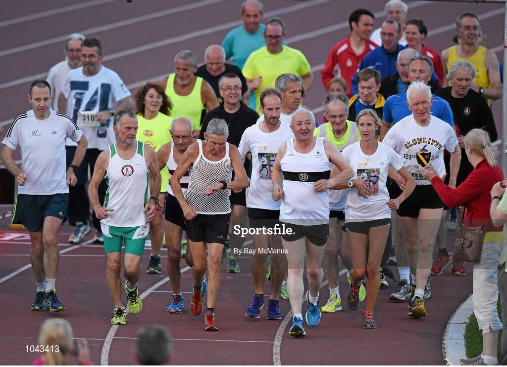 18 August 2015; Frank Greally, with Cahterina McKiernan to his left, who set a record for the 10,000M 45 years ago on this day, pictured as he leads the pack around Morton Stadium for 30.17 - the record time set on the night. Frank Greally's Gratitude Run. Morton Stadium, Dublin Picture credit: Ray McManus / SPORTSFILE