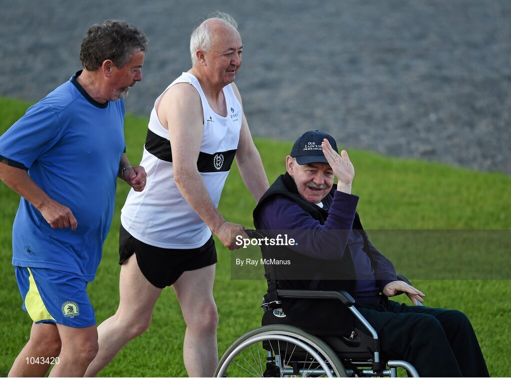 18 August 2015; Frank Greally, who set a record for the 10,000M 45 years ago on this day, pictured as he and two great friends, Neil Cusack, left, and Ray McBride, start running around Morton Stadium for 30.17 - the record time set on the night. Frank Greally's Gratitude Run. Morton Stadium, Dublin Picture credit: Ray McManus / SPORTSFILE