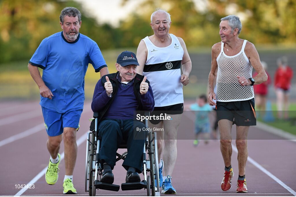 18 August 2015; Frank Greally, centre right, who set a record for the 10,000M 45 years ago on this day, runs a lap with 1974 Boston Marathon winner Neil Cusack, from left, former athlete and actor, Ray McBride, and former English Olympic marathon runner Ron Hill at Morton Stadium before running for 30.17 - the record time set on the night. Frank Greally's Gratitude Run. Morton Stadium, Dublin. Picture credit: Cody Glenn / SPORTSFILE