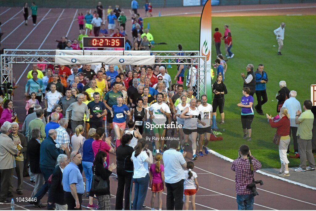18 August 2015; Athletes follow Frank Greally, who set a record for the 10,000M 45 years ago on this day, pictured as he runs around Morton Stadium for 30.17 - the record time set on the night. Frank Greally's Gratitude Run. Morton Stadium, Dublin Picture credit: Ray McManus / SPORTSFILE