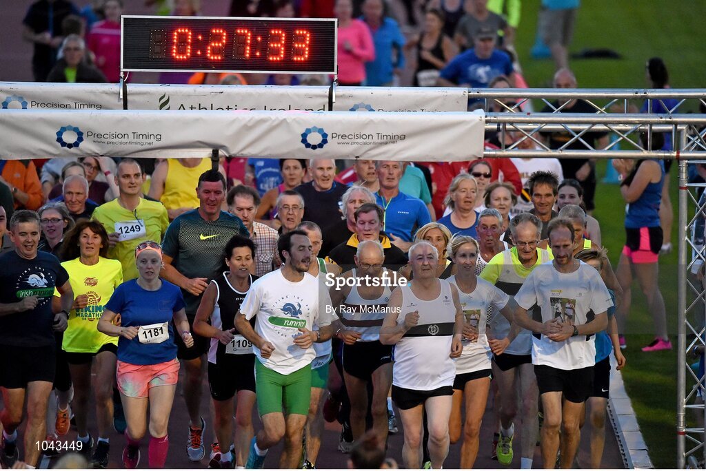 18 August 2015; Athletes follow Frank Greally, who set a record for the 10,000M 45 years ago on this day, pictured as he runs around Morton Stadium for 30.17 - the record time set on the night. Frank Greally's Gratitude Run. Morton Stadium, Dublin Picture credit: Ray McManus / SPORTSFILE