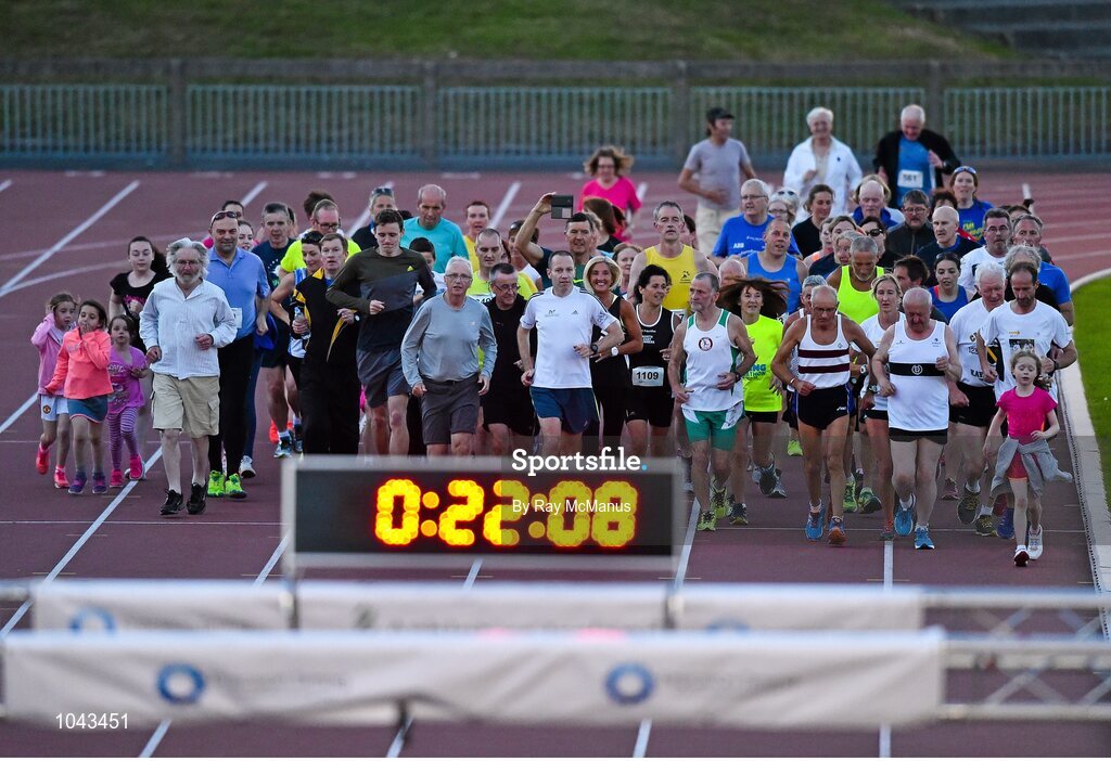 18 August 2015; Athletes follow Frank Greally, who set a record for the 10,000M 45 years ago on this day, pictured as he runs around Morton Stadium for 30.17 - the record time set on the night. Frank Greally's Gratitude Run. Morton Stadium, Dublin Picture credit: Ray McManus / SPORTSFILE