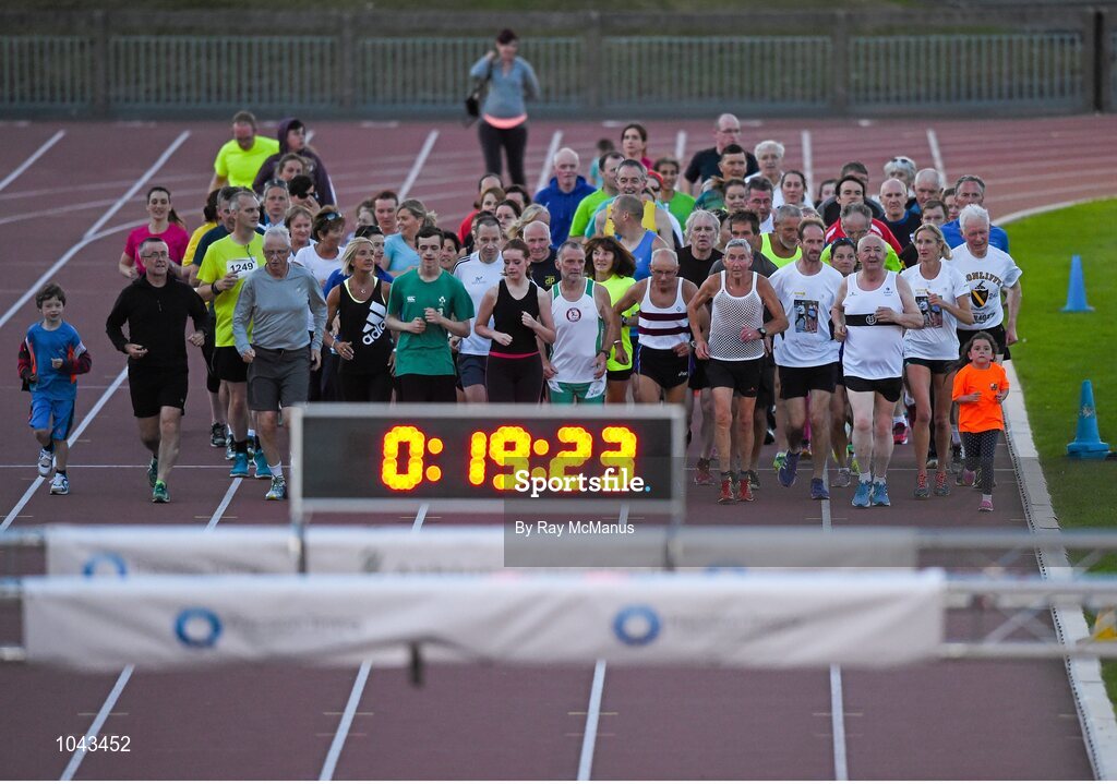 18 August 2015; Athletes follow Frank Greally, who set a record for the 10,000M 45 years ago on this day, pictured as he runs around Morton Stadium for 30.17 - the record time set on the night. Frank Greally's Gratitude Run. Morton Stadium, Dublin Picture credit: Ray McManus / SPORTSFILE