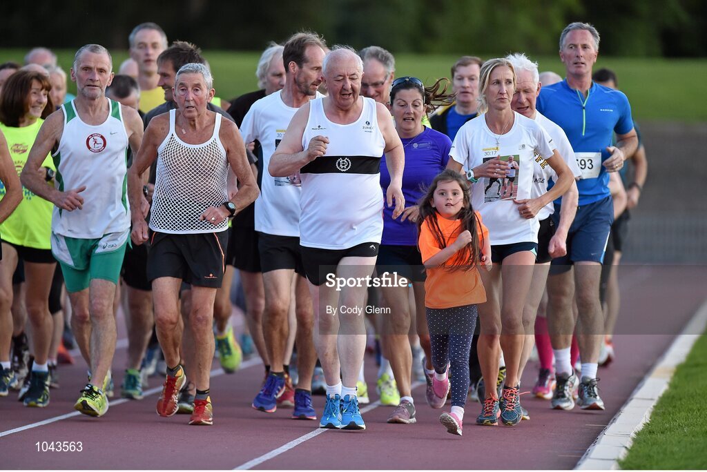 18 August 2015; Frank Greally, who set a record for the 10,000M 45 years ago on this day,runs alongside granddaughter Hayleigh Bone, age 6, around Morton Stadium during his run of 30.17 - the record time set on the night. Frank Greally's Gratitude Run. Morton Stadium, Dublin. Picture credit: Cody Glenn / SPORTSFILE