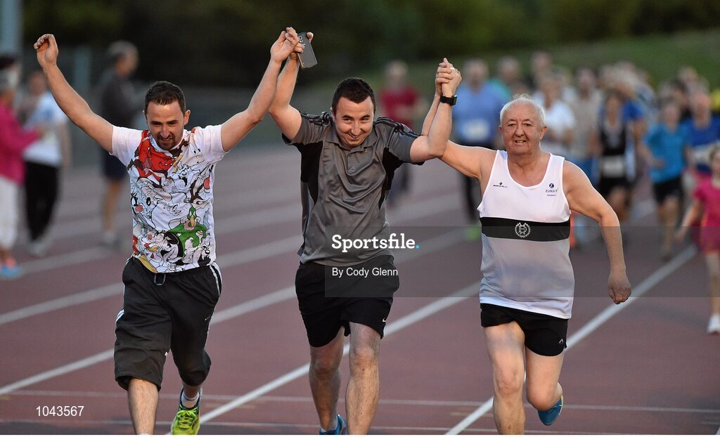 18 August 2015; Frank Greally, right, with his sons Tomás, left, and Conor, centre, who set a record for the 10,000M 45 years ago on this day, pictured during the final lap while running around Morton Stadium for 30.17 - the record time set on the night. Frank Greally's Gratitude Run. Morton Stadium, Dublin. Picture credit: Cody Glenn / SPORTSFILE