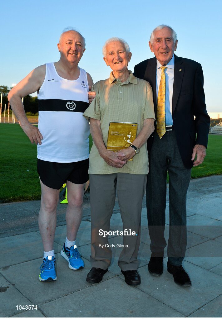 18 August 2015; Tommy Hayward, centre, a long-time Donore Harriers member, pictured with Frank Greally, left, after being presented with Ronnie Delany's book "Staying The Distance" from Ronnie Delany, right, Irish Olympic 1500m gold medallist. Frank Greally's Gratitude Run. Morton Stadium, Dublin. Picture credit: Cody Glenn / SPORTSFILE