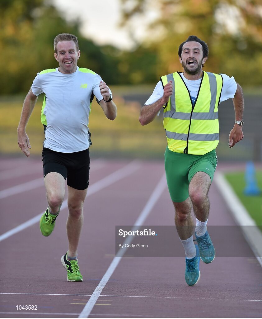18 August 2015; John Travers, Donore Harriers, left, and Feidhlim Kelly, Raheny Shamrocks A.C., run a lap at the Irish mile record pace. Frank Greally's Gratitude Run. Morton Stadium, Dublin. Picture credit: Cody Glenn / SPORTSFILE