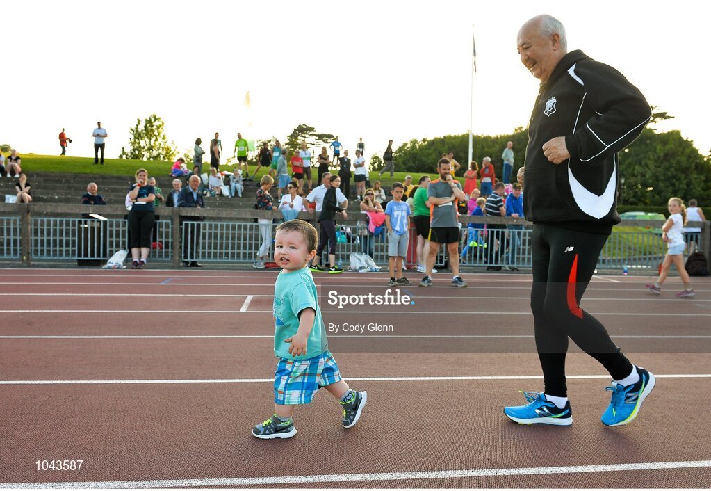 18 August 2015; Frank Greally warms up with his grandson Luke Branigan Greally, age 2. Frank Greally's Gratitude Run. Morton Stadium, Dublin. Picture credit: Cody Glenn / SPORTSFILE